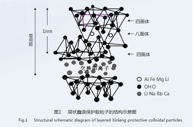 鑫浪多彩保護膠的化學結構通式為Mx[LixMg6-xSi8O20 (OH)yF4-y](M=Na、Li),是一種無機硅酸鹽 層狀納米礦物材,屬于單斜晶系 。由硅-氧四面體和鎂-氧八面體在豎直方向上以 2∶1 的周期性排 列堆積而成,其分子結構如圖 1所示。硅-氧四面體由一個Si 原子與四個 O 原子連接構成,Si原子 在四面體的中心,四個 O 原子在四面體的四個頂角處;鎂-氧八面體中,鎂原子位于八面體的中心, 八面體頂點的氧原子還與相鄰的鎂原子組成另外的八面體。